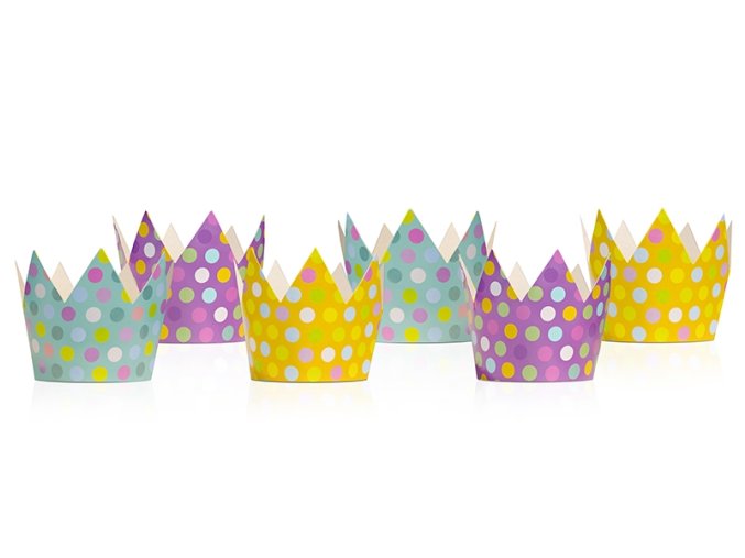 Papírové party puntíkaté korunky v barvách žlutá, tyrkysová a fialová. Výška 10 cm
