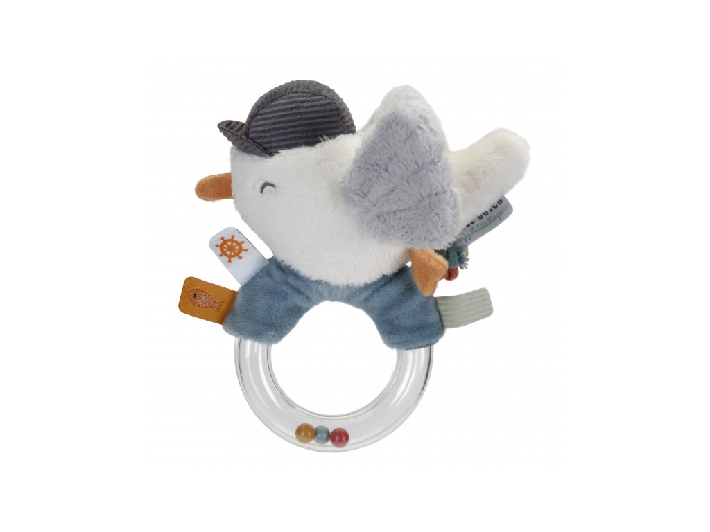 Originální chrastítko v podobě průhledného kroužku s chrasticími korálky a plyšovým rackem je ideální jako první hračka pro vaše miminko. Chrastítko má tvar pro snadné uchopení a různorodé textury pro zkoumání rukama i ústy. Křídla racka při zmáčknutí šustí.
